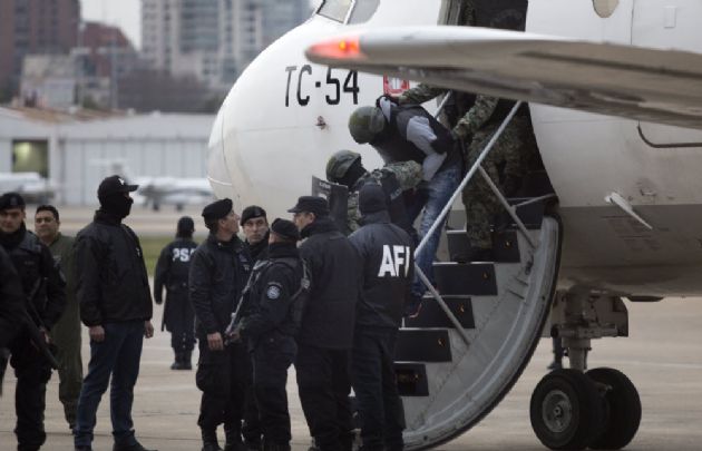 El detenido, que estaba prófugo desde 2012, arribó a la Base Aérea Militar Aeroparque (BAMA) a las 17.15, fuertemente custodiado por personal del grupo Alacrán de Gendarmería, con chaleco antibalas y protegido por escudos.