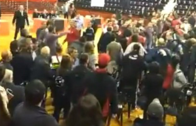 La asamblea apenas duró cinco minutos en los que el secretario del club, José Menchón, y el dirigente de la agrupación opositora ADN Leproso Daniel Giraudo discutieron luego de una primera votación para elegir al presidente del acto (se pretendía aprobar el balance de 2016-2017).